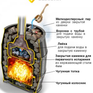 Все элементы топки отлиты из чугуна и соединены между собой с помощью болтового соединения через термостойкий шнур и герметик, а закрытая каменка изготовлена из жаростойкой высоколегированной 4 мм нержавеющей стали. На всех печах «Сандуны 24 (270)» установлены чугунные герметичные топочные двери с жаропрочным стеклом.