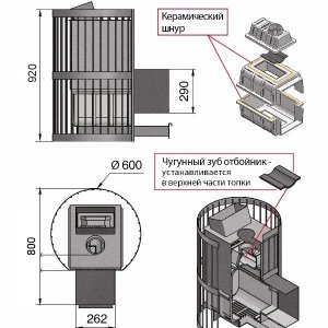В конструкции данной печи предусмотрен топочный тоннель, при помощи которого печь топится из соседнего помещения, смежного с парильным.